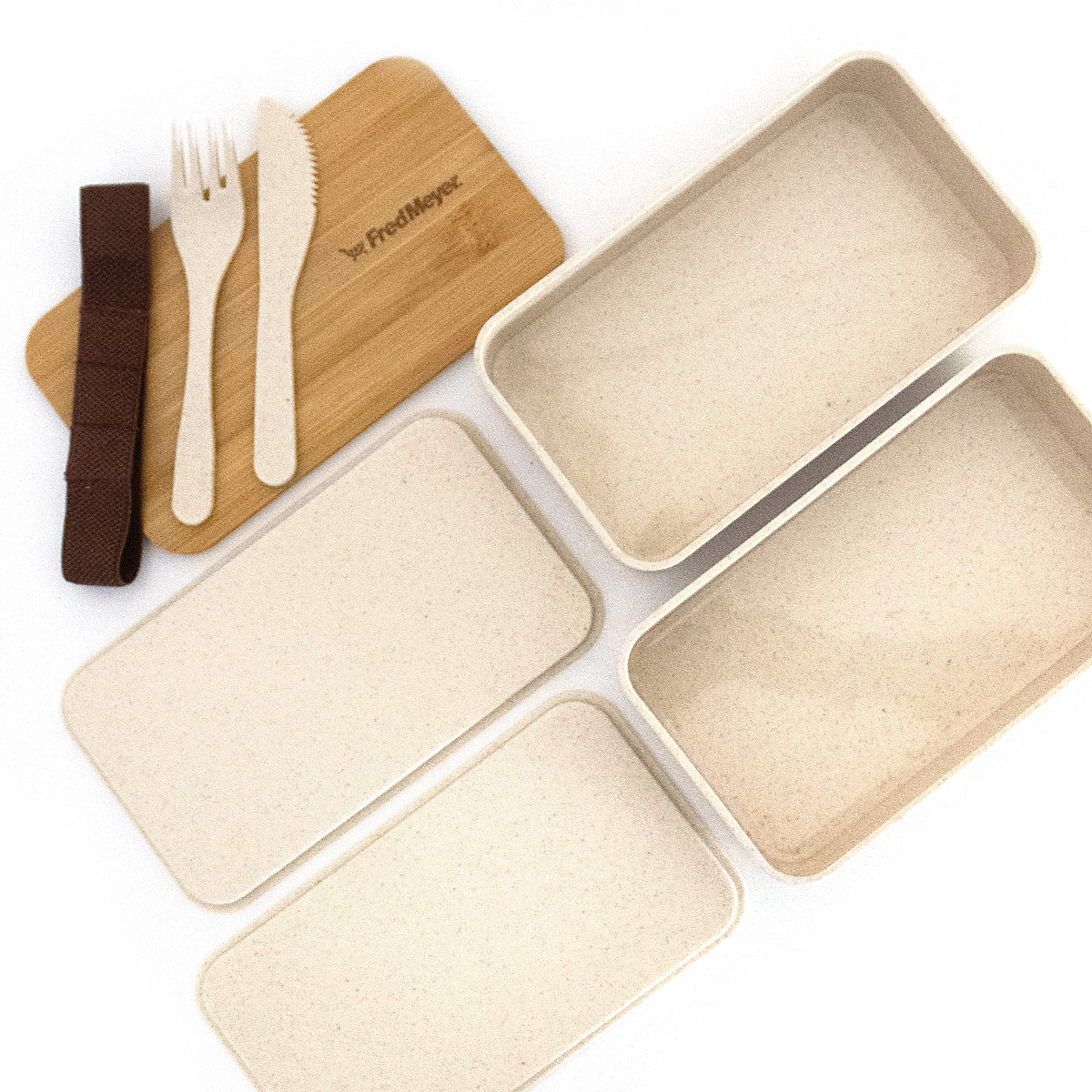 The Savory Lunch Box Set is a 2-compartment bento-style lunch box and cutlery set ideal for food storage or work lunches. Part of the Collection, the stackable containers, knife and fork are made from a blend of renewable wheat straw and BPA-free polypropylene. The top lid is made from bamboo and has a dual function as an eating surface or cutting board. Carry and store it bound together with its one-inch wide elastic closure.